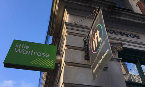 There's a tip-top selection of sweet treats including puffy mince pies, Christmas gingerbread, lemon drizzle loaf, funfetti (!) cookies, carrot cake, and Victoria sponge. Top-left, though, is shouting out to me: it's the Old School Cake, a slab o' sponge with white icing covered with 100s & 1000s. Yes, please! With no chai latte available, Andy joins me in a flat white but of the decaf variety, unlike mine. Window lettering reads "Good Coffee / Great People / Big Hearts". Amen to that.